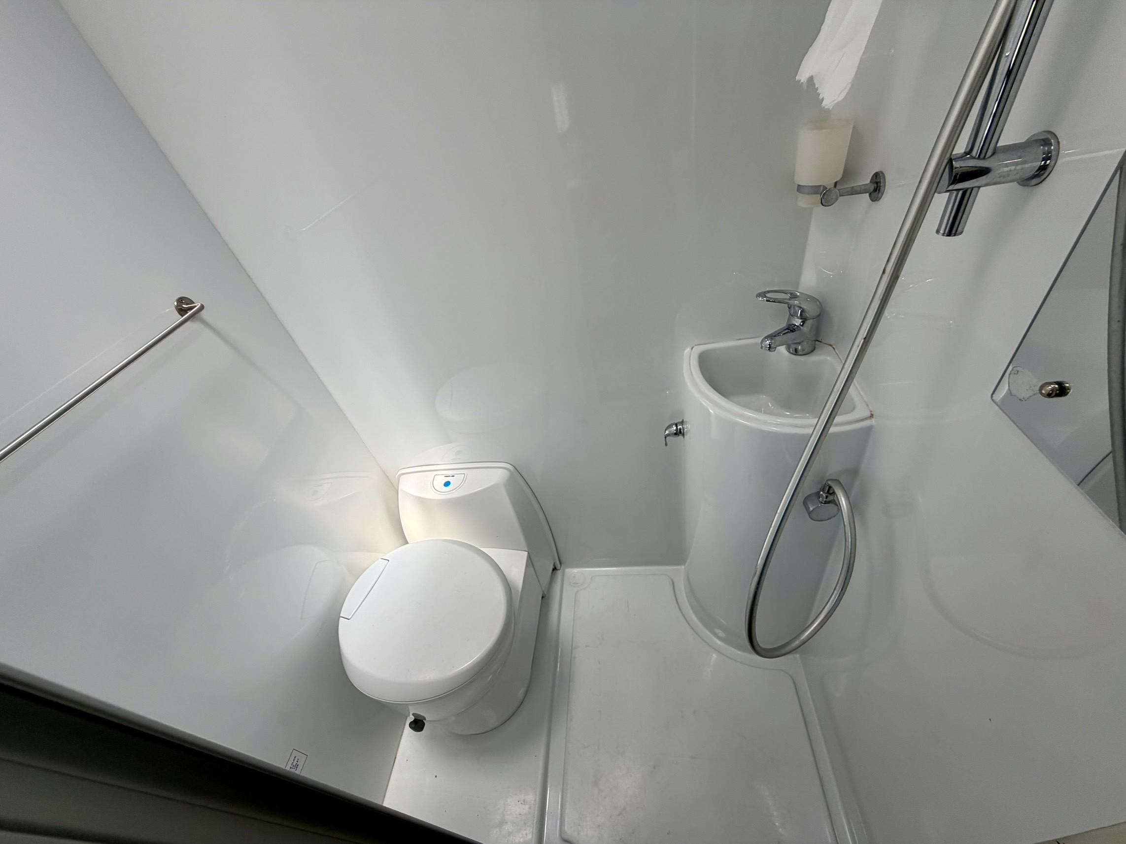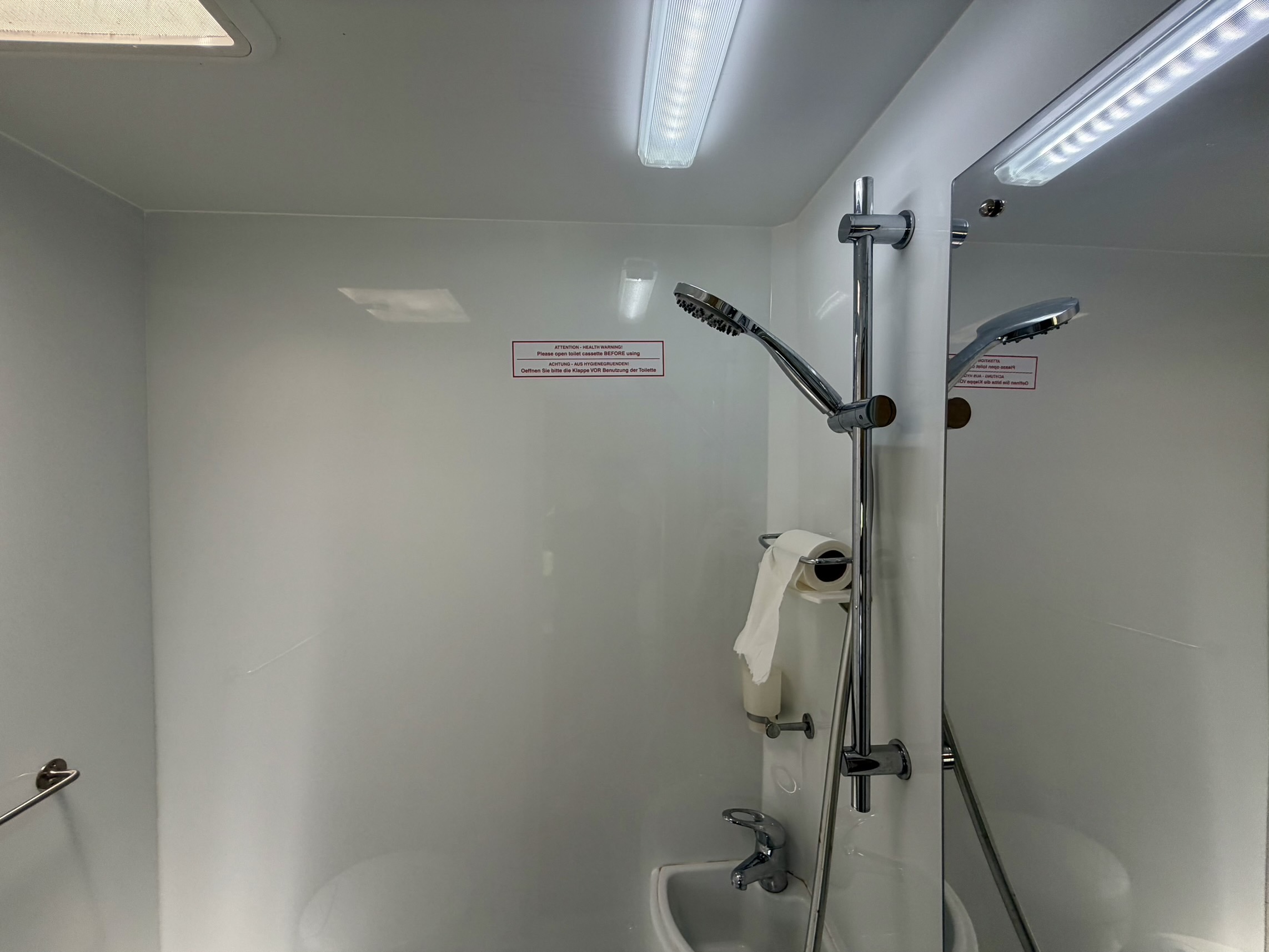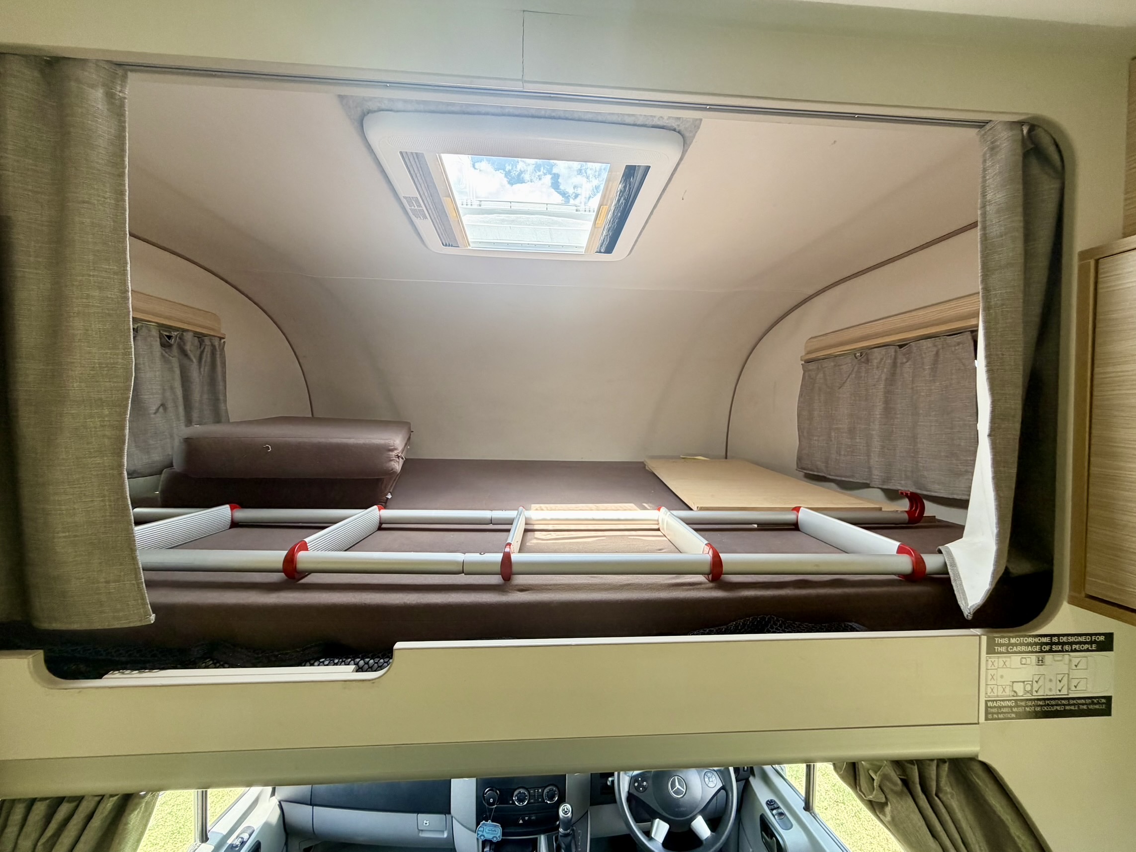 Above the driver’s cabin is an exceptionally large main bed, which can also double as a substantial storage area when not in use — perfect for longer trips or extended touring. Completing the package is a fully equipped kitchen and a private onboard bathroom, ensuring you have all the comforts of home wherever the road takes you.