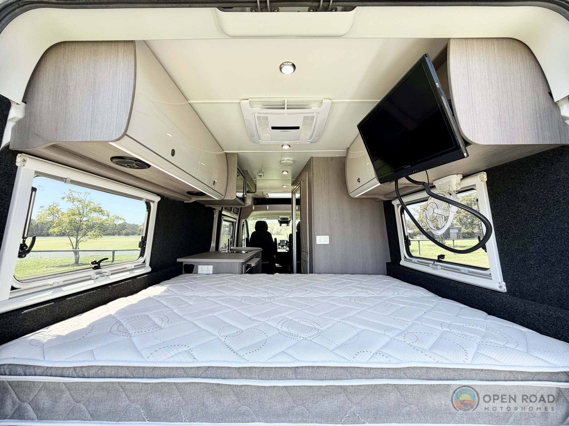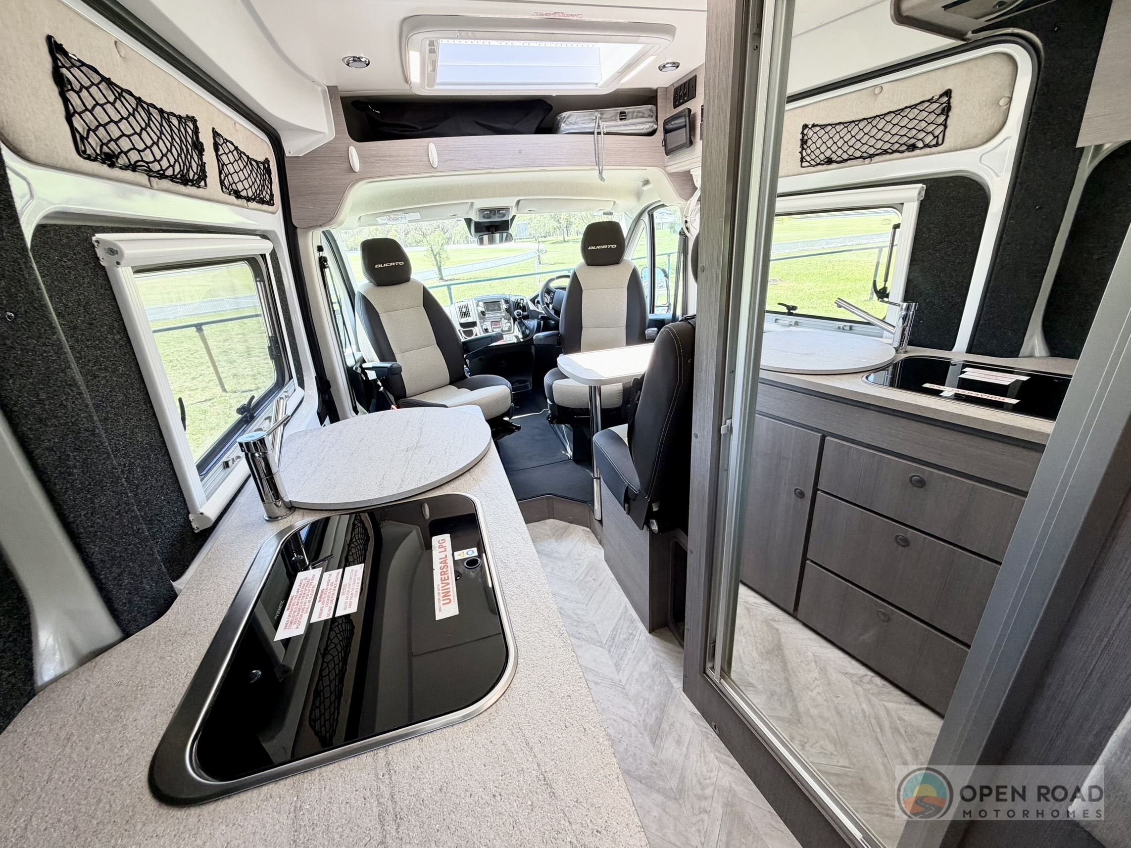 One of the most popular designs of compact motorhome with a permanent rear bed, large 4-person lounge, large bathroom and full kitchen. Small enough to easily drive and park around town yet the clever design makes it spacious to live in.