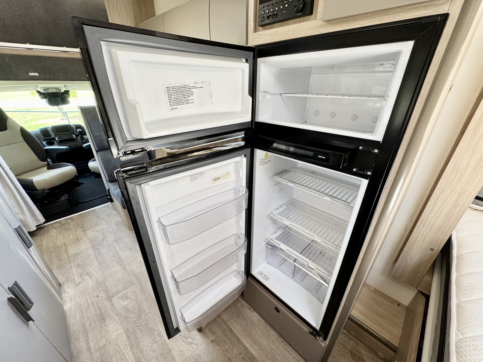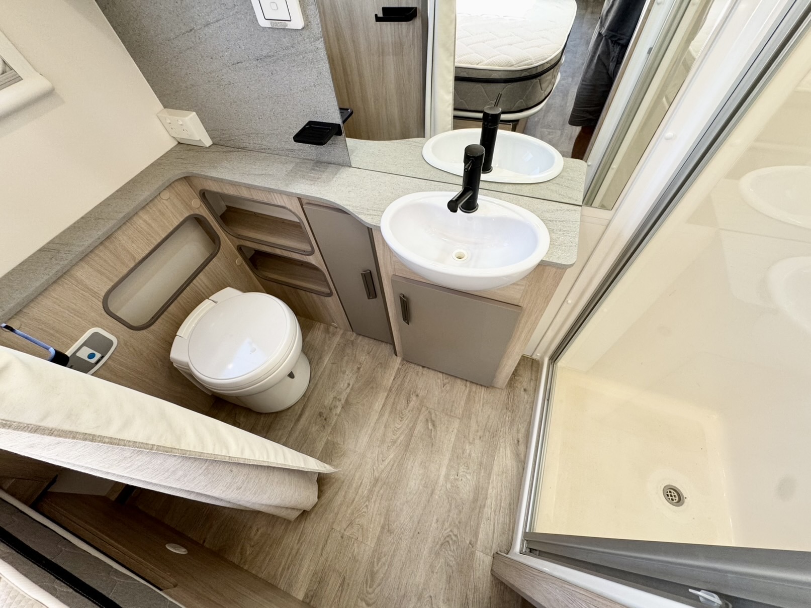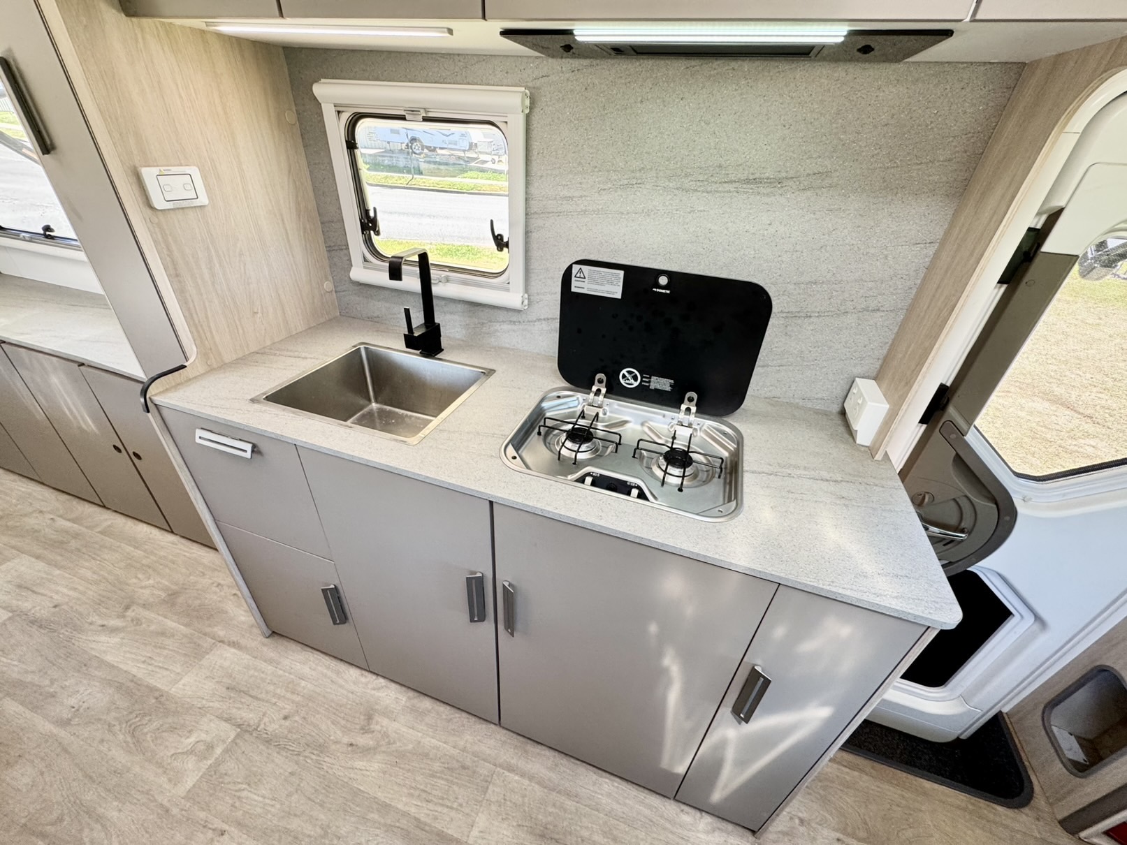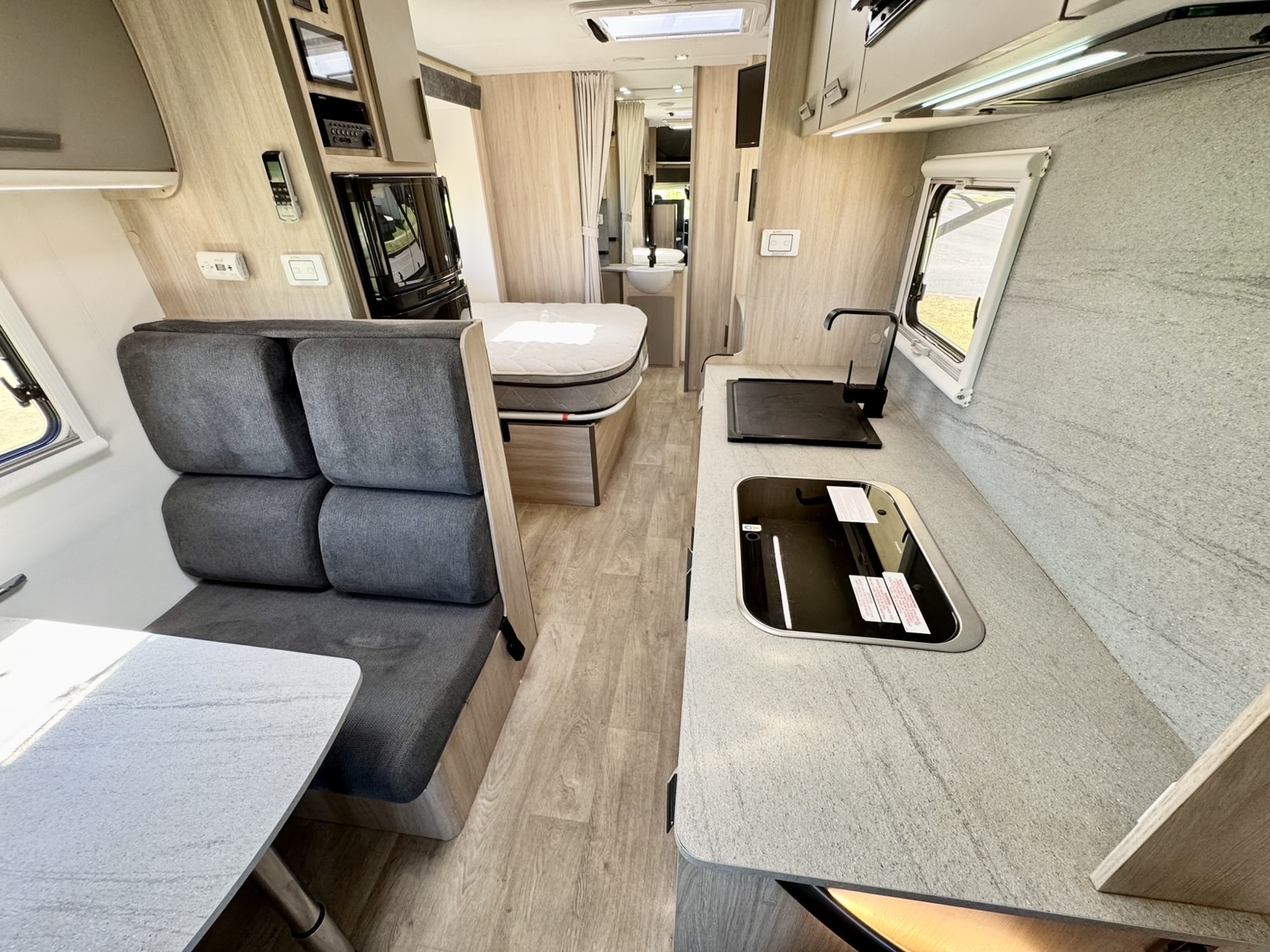 The second double bed above the driver’s cabin provides extra sleeping space, while the 2.3L turbo diesel Fiat Ducato engine paired with a 9-speed automatic gearbox delivers smooth, powerful, and fuel-efficient performance wherever the road takes you.