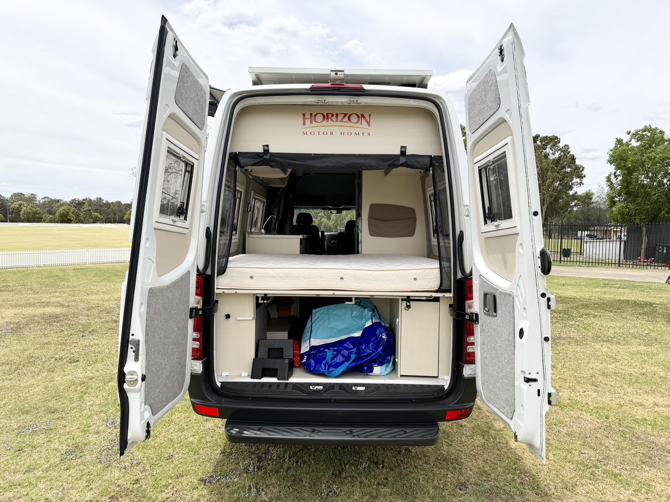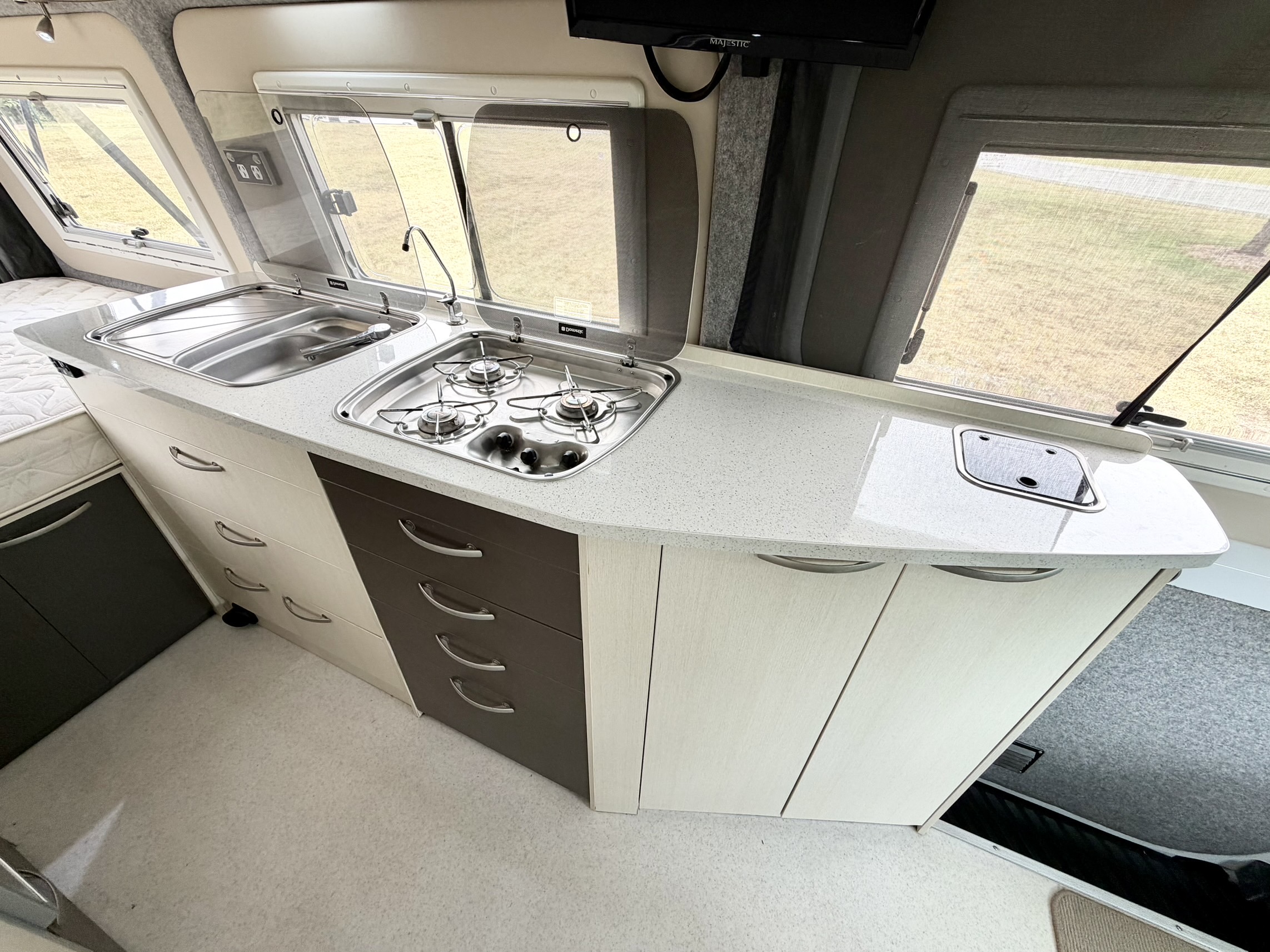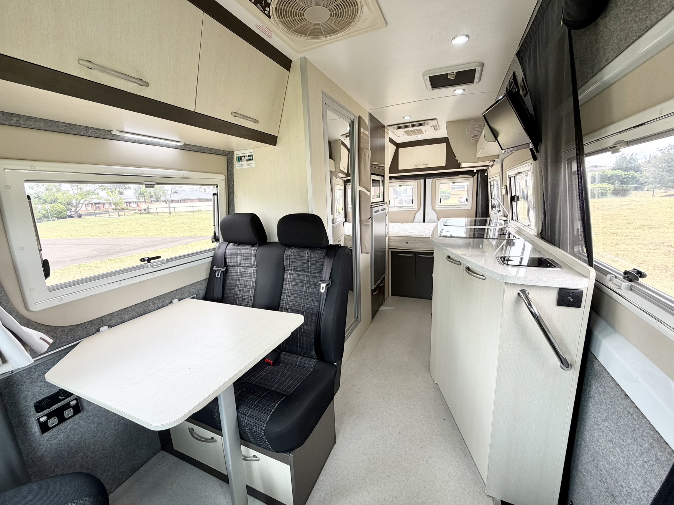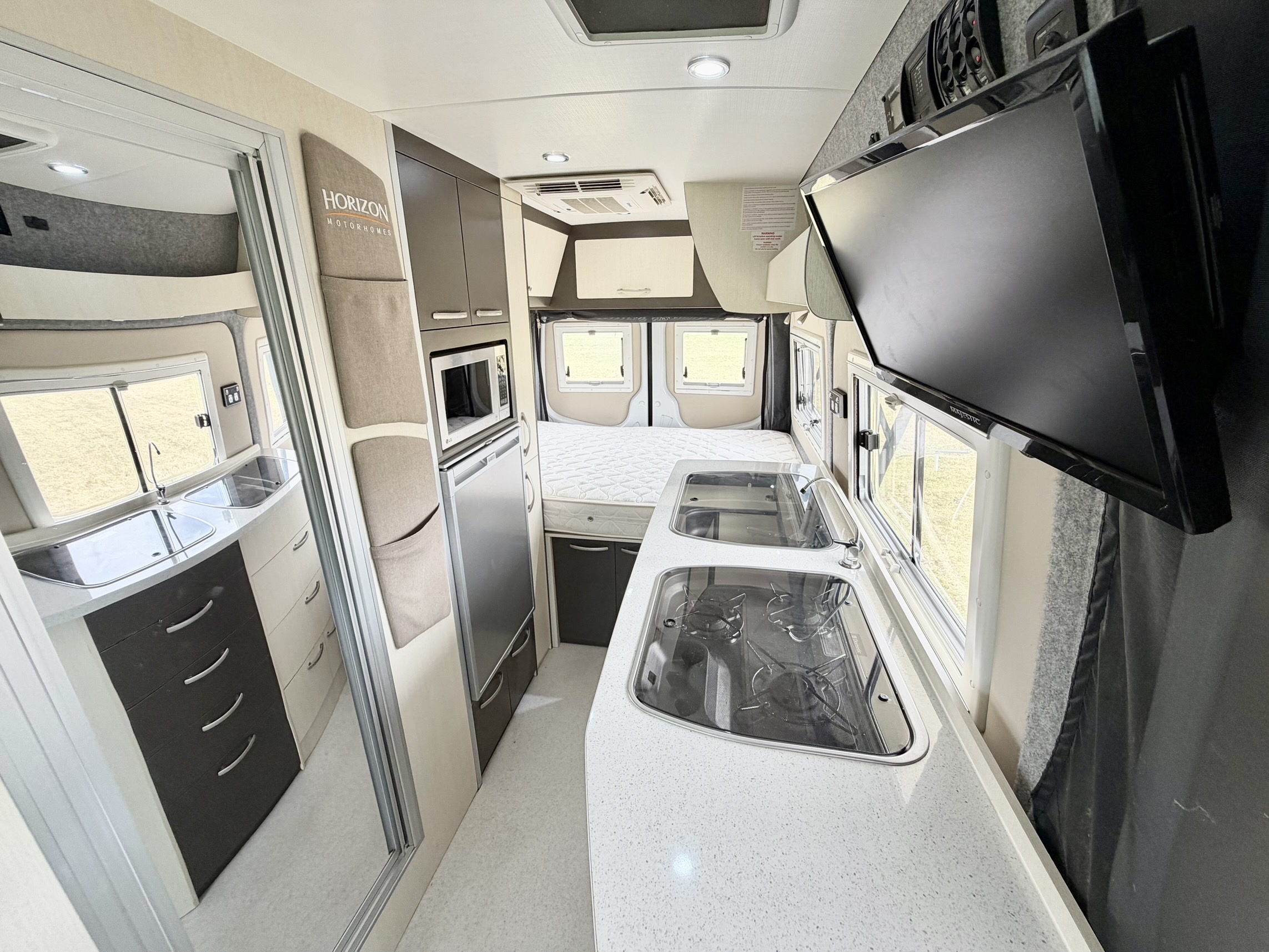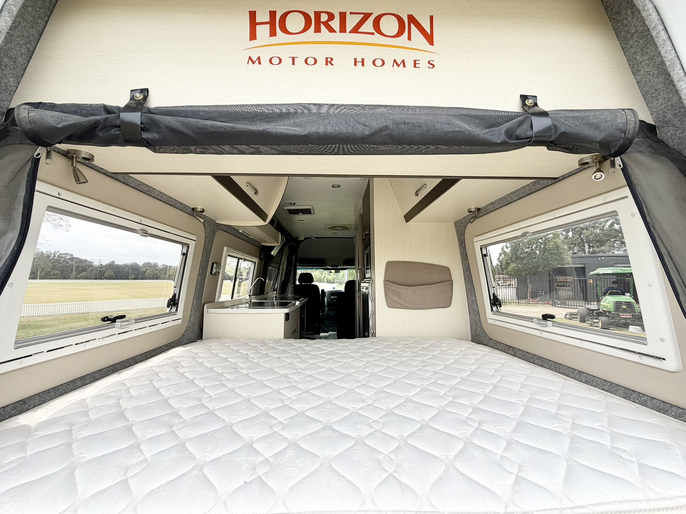 Crafted by Multi Award-Winning Horizon Motorhomes, the Acacia features one of their most popular and proven layouts. Enjoy a spacious rear double bed, a fully equipped mid-kitchen and bathroom, and swivel driver and passenger seats that transform the front cab into a comfortable 4-seat dining and living area. It’s intelligent design at its best — practical, luxurious, and ready for adventure.