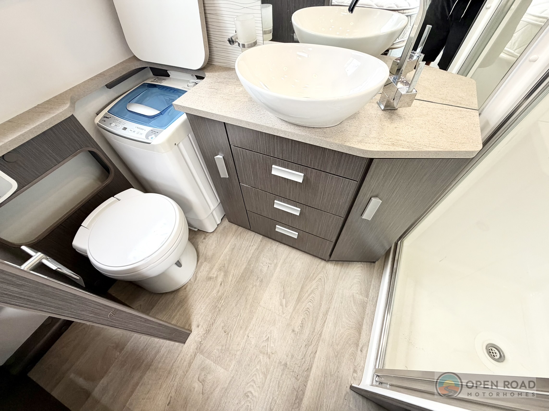 Fitted with thousands of dollars extras including leather upholstery, 16” Black Alloy wheels, bullbar, washing machine, electric awning, large fridge/freezer, picnic table & towbar.