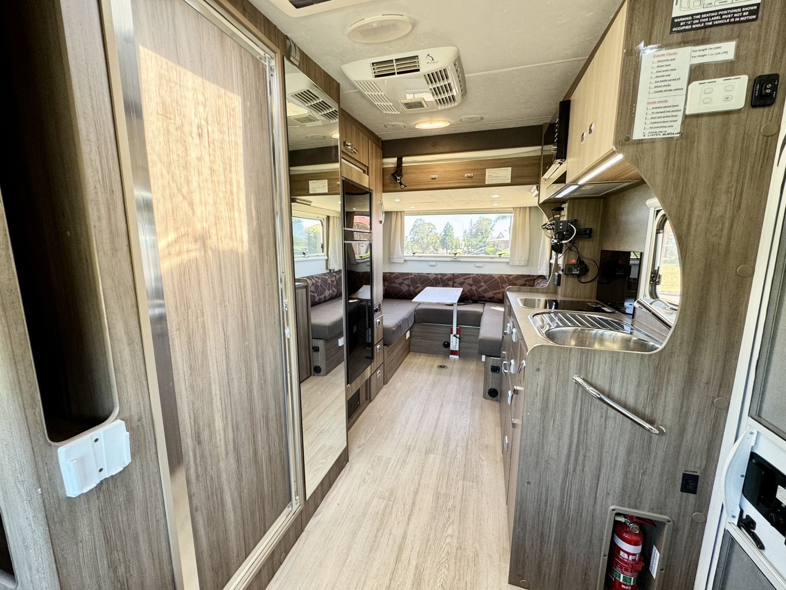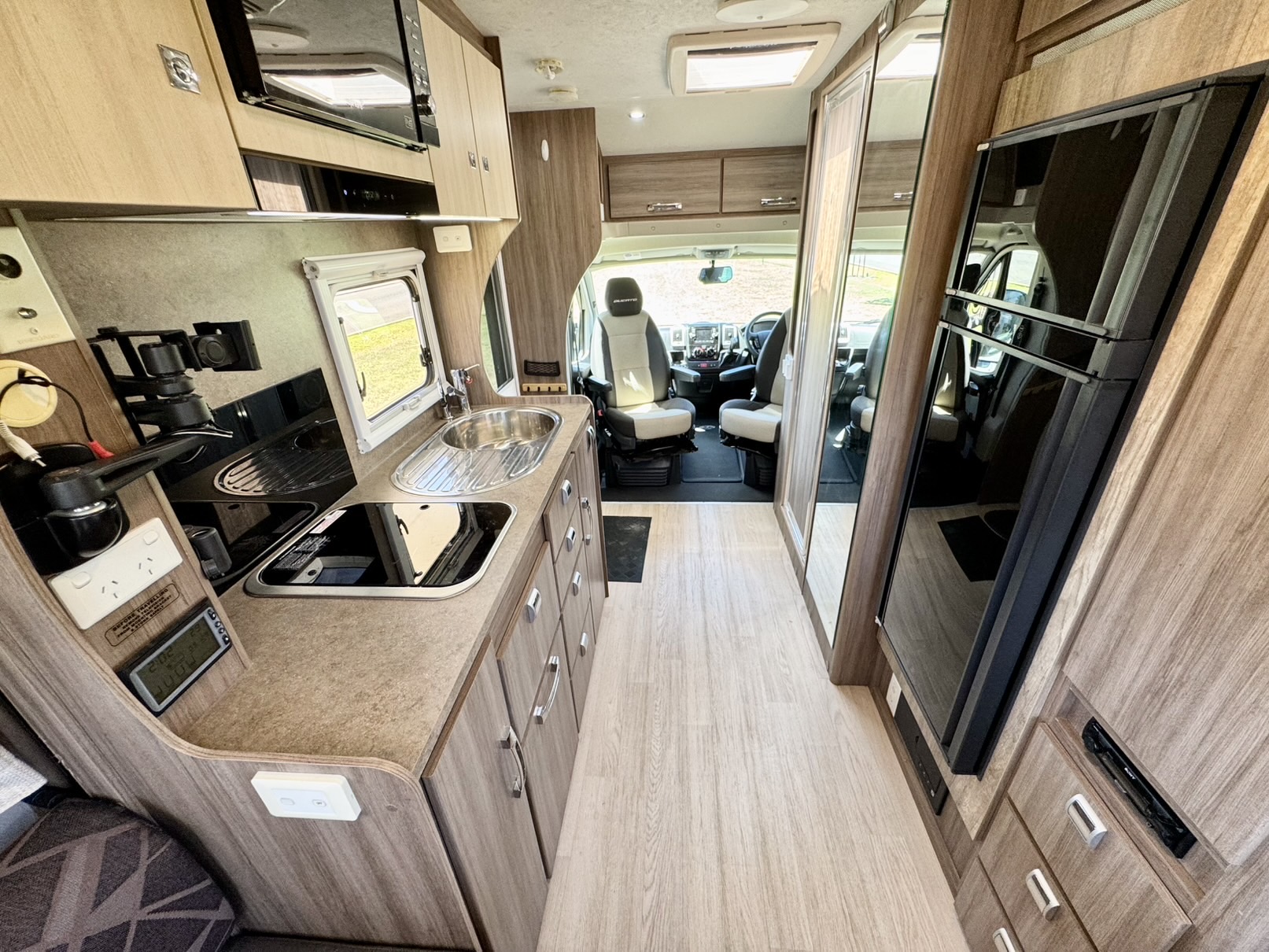 In the middle of the motorhome there is a fully equipped kitchen along with a shower & toilet and lots of useful storage.