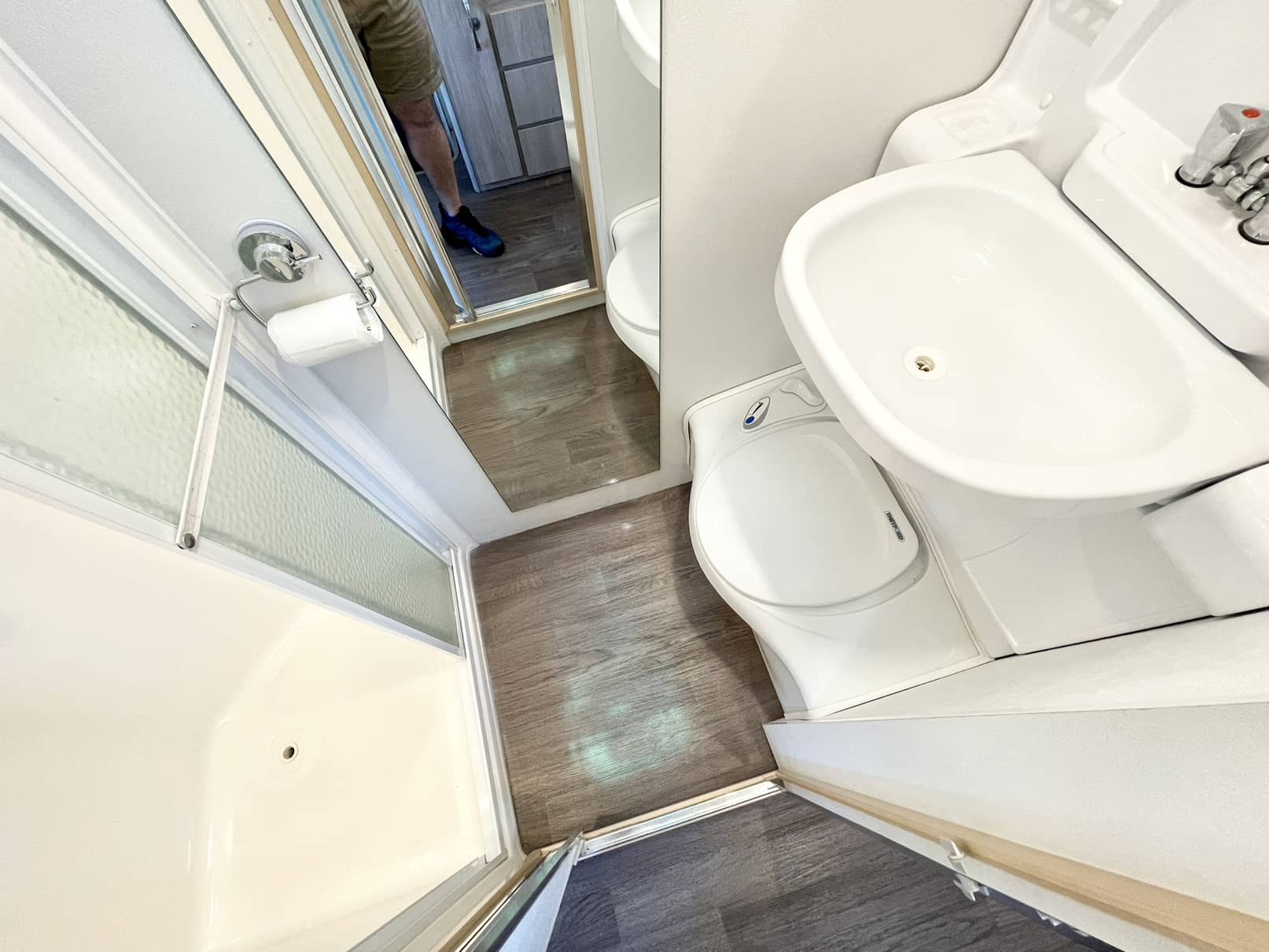 Fully equipped with on board kitchen, LARGE BATHROOM with separate shower & toilet plus a second queen sized bed above the driver’s cabin.