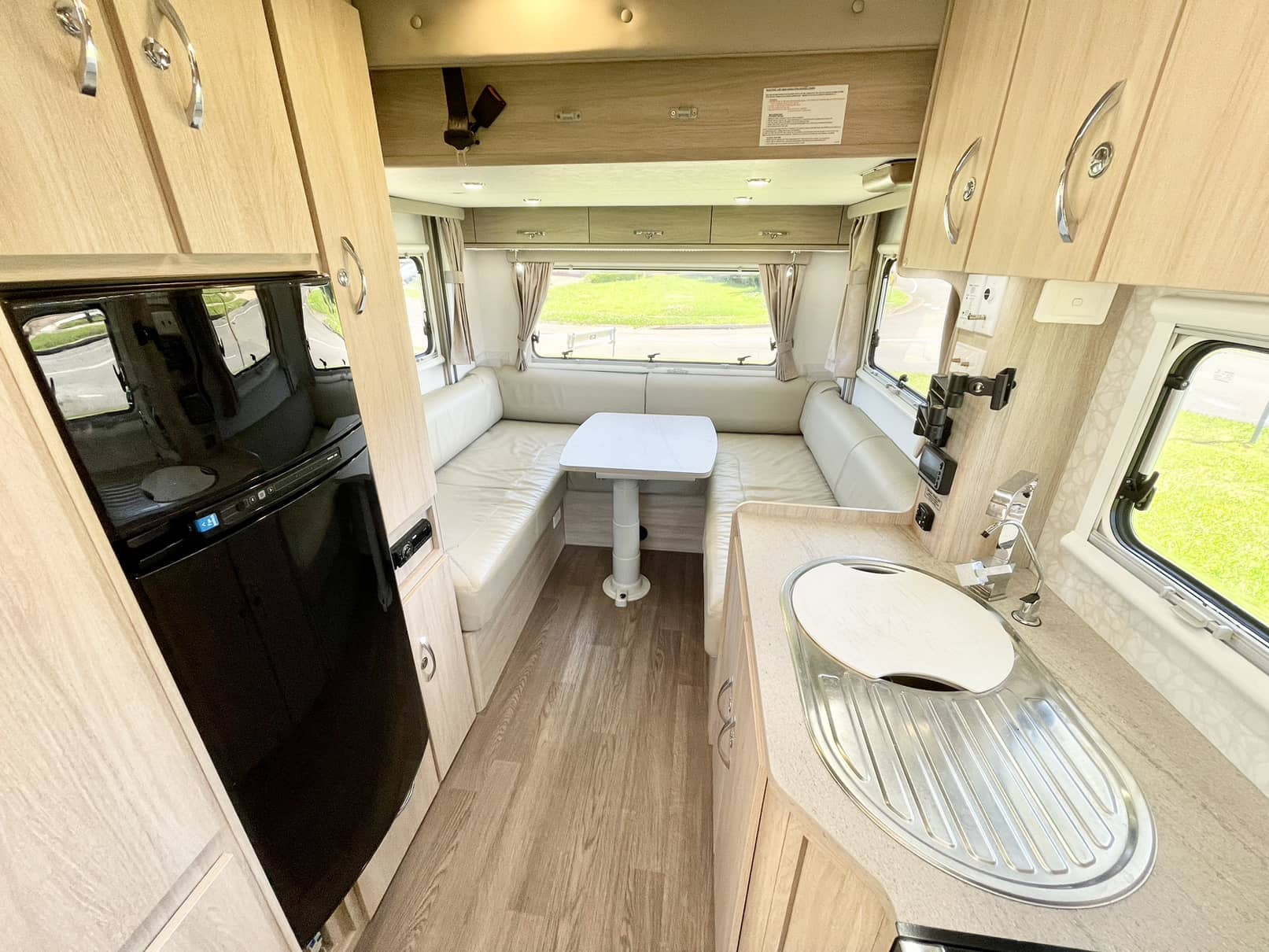 Beat the waiting list & save thousands of dollars over new. One of the Country’s most sought after models of motorhome. The clever layout provides a HUGE, HOME STYLE, 5 SEATER LOUNGE at the rear with panoramic picture windows all around, and at the push of a button, a queen-sized bed lowers down from the ceiling.